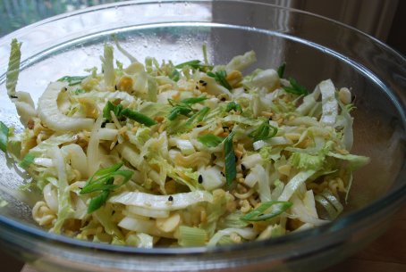 Mix cabbage, green onion & chicken in large bowl. Put Ramen noodles in a Ziploc bag and break up with a rolling-pin. Pour Ramen noodles into skillet on medium-low heat and toast with nuts, and seeds until just golden. Set aside until the salad is ready to be served.