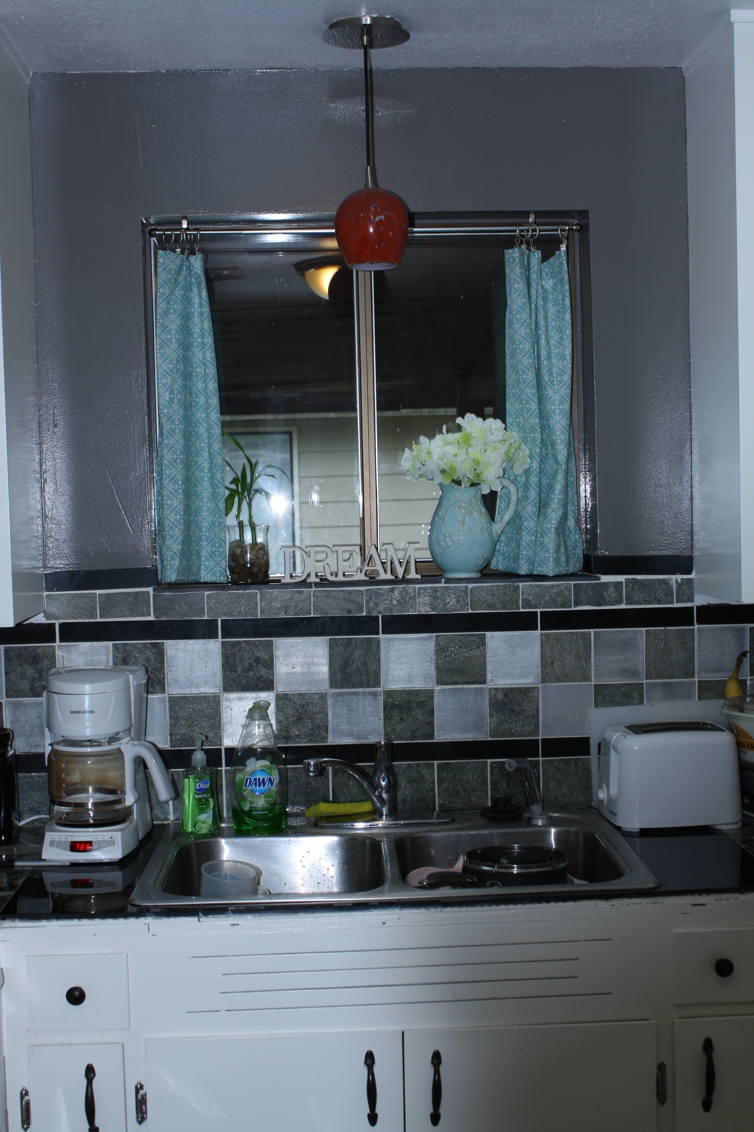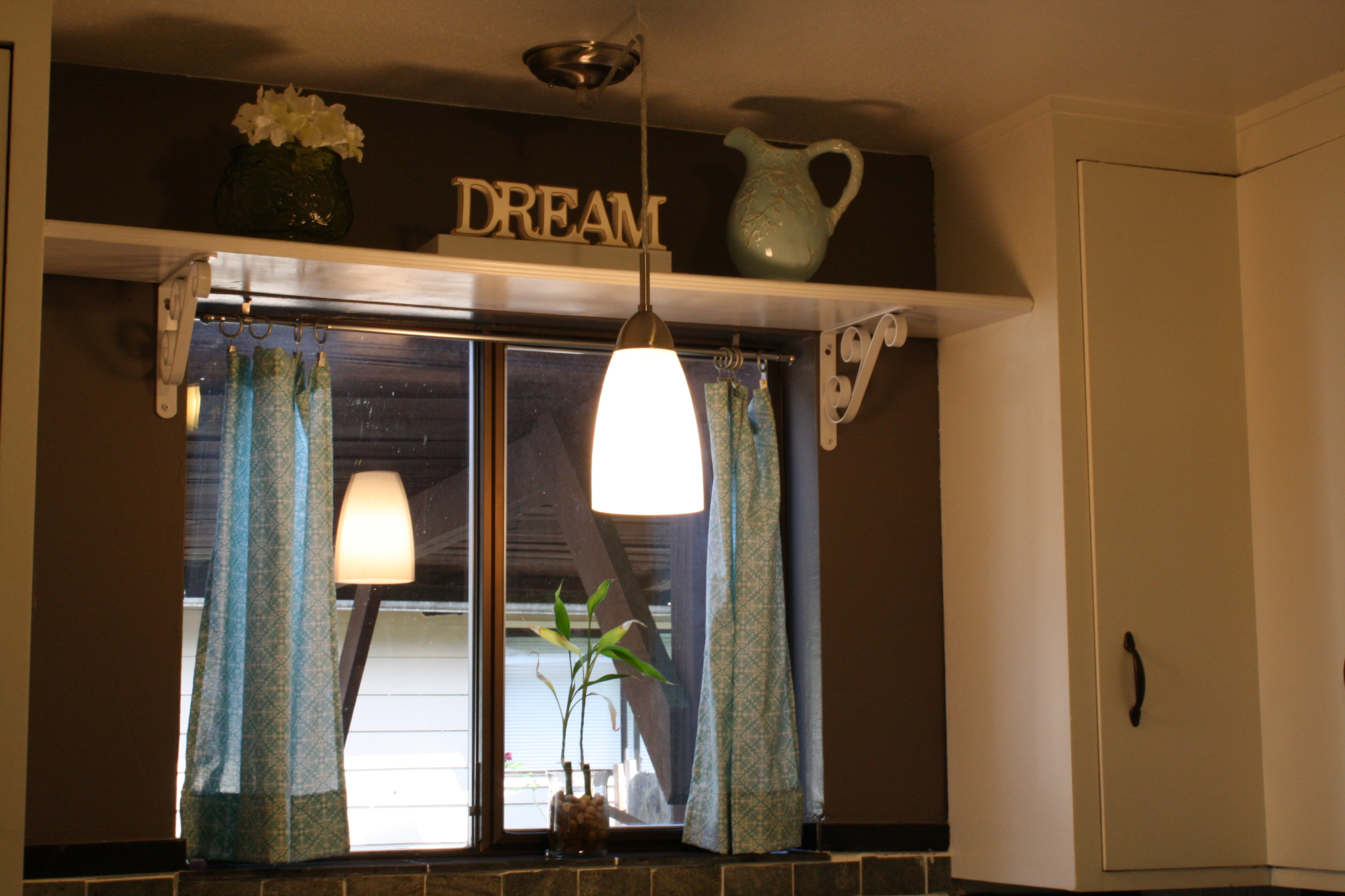 So another project has been finished at our house! Like i said in an earlier post I asked Tom to build me a shelf above my kitchen sink for my birthday. I love how it turned out and it really changes the feel of my kitchen. My grandma gave me a Home Depot gift card so I got a new light for the kitchen as well.