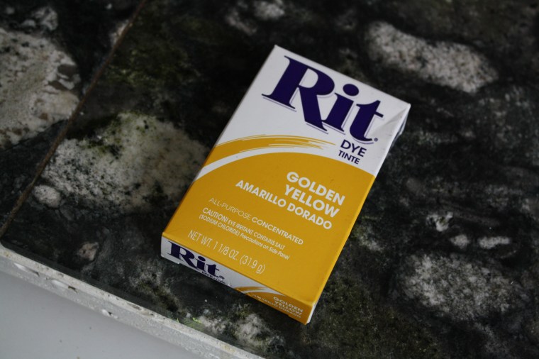 The color I used is called Golden Yellow – if you want a specific color that they don’t sell this link to the Rit Dye website that will tell you how to mix ANY Color!! It’s super cool and really easy to mix colors! I’m going to try it next time! I filled my sink 1/3 of the way full with hot water then poured 1/2 the pack of dye into a measuring cup and let it dissolve for a couple of minutes (stirring often). It’s really important that the dye is completely dissolved otherwise your fabric will not dye evenly!
