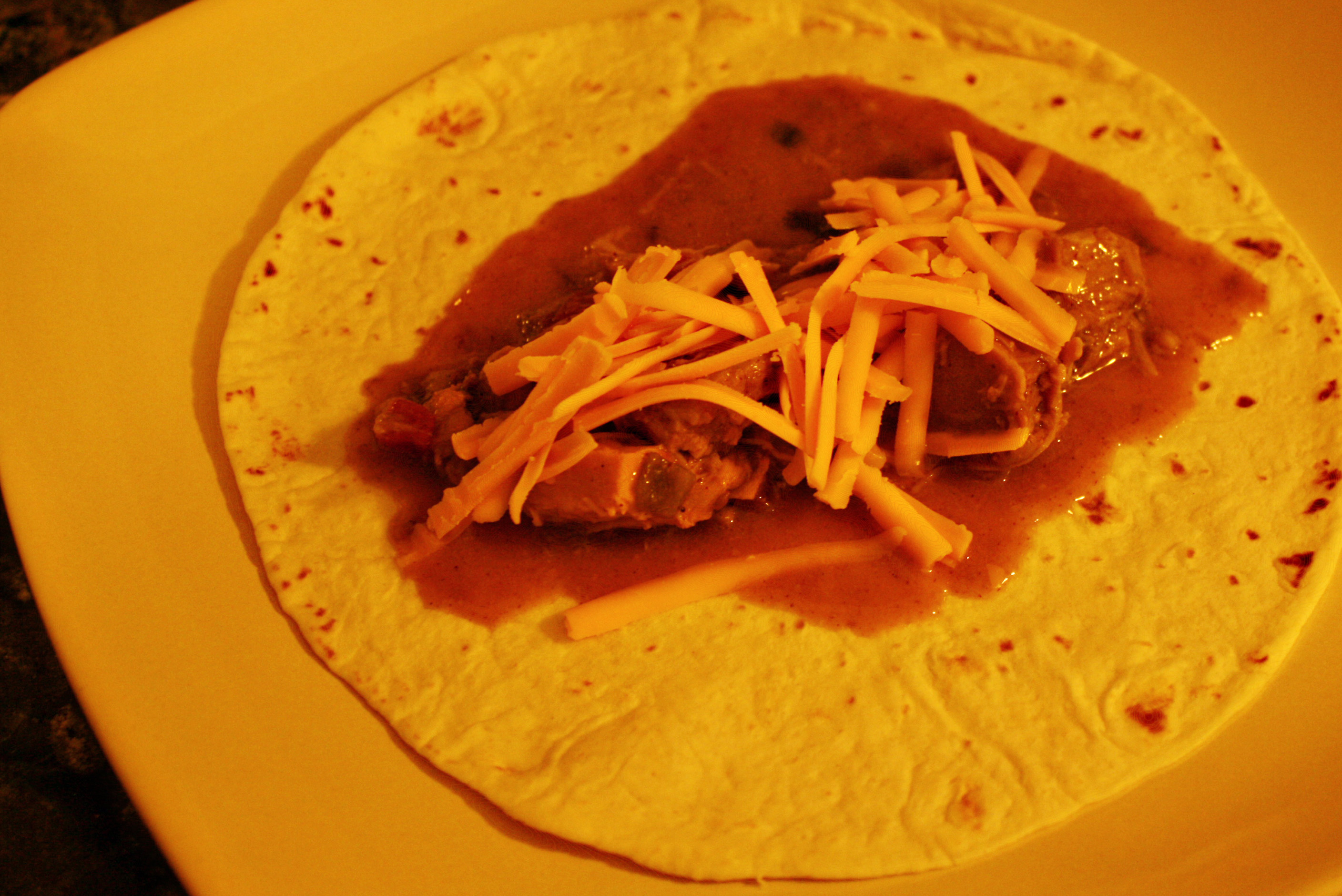 Some of this may seem a little weird but trust me it’s worth it. First put your tortilla on the plate. To add meat use a ladle or slotted spoon to get some chunks of meat but try to drain of as much of the juices as possible. Add cheese. Microwave for about 15 seconds. This will help melt the cheese and it softens the tortillas to help during the folding process.