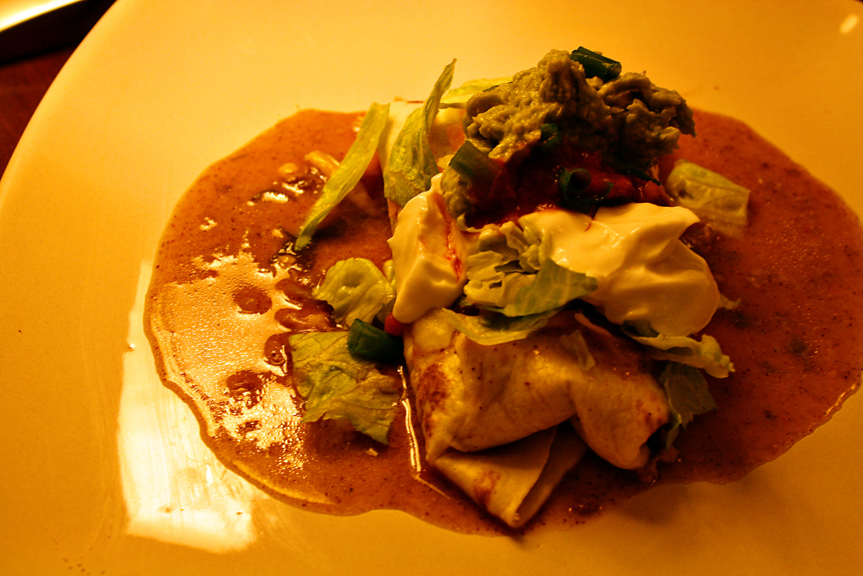 Fold all 4 sides in then flip it over! This has to be done quickly or you will have a big mess. Pour some of the juices over the burrito and add your favorite toppings! We topped ours with, sour cream, salsa, guacamole, green onions, lettuce and more cheese. Enjoy!