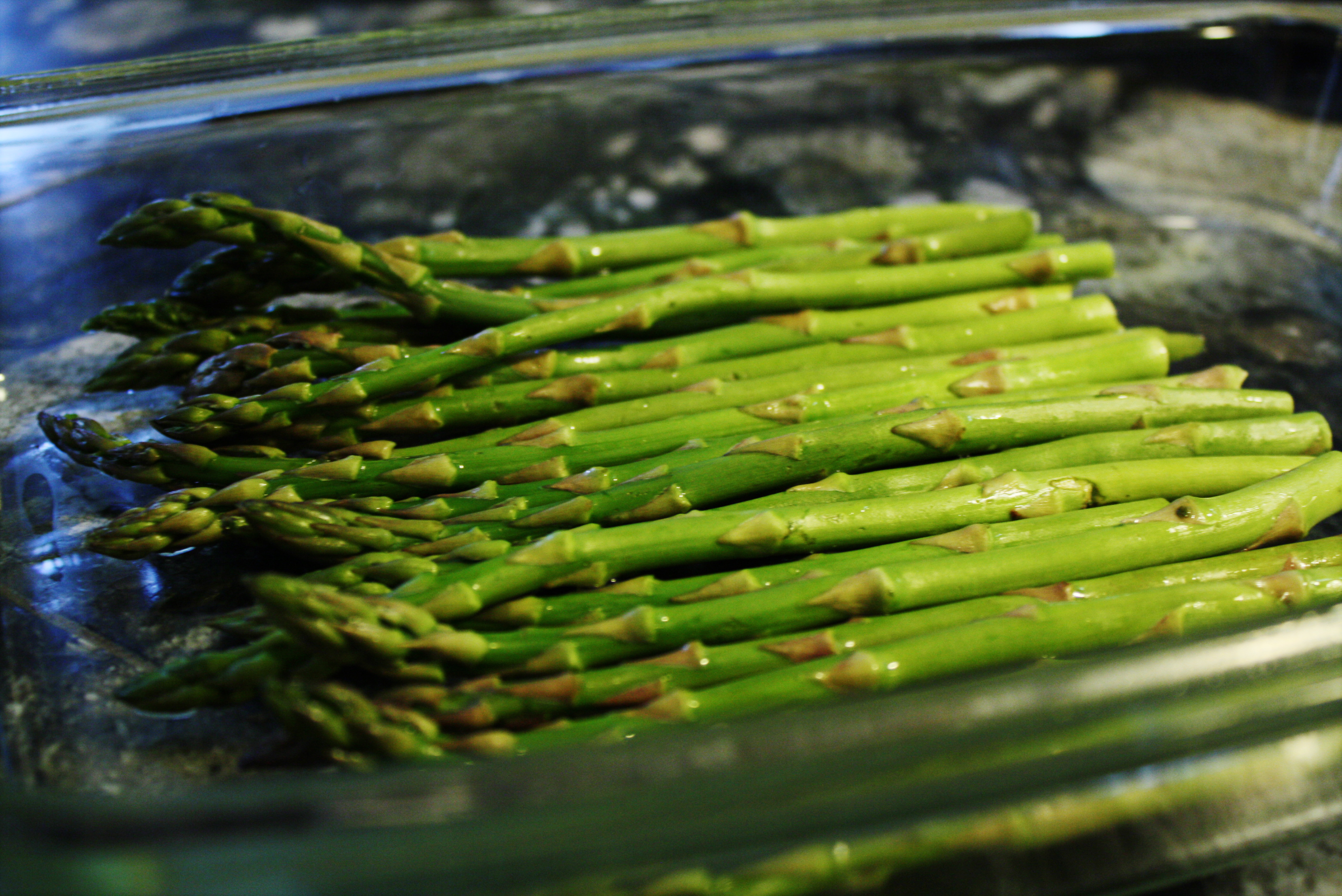 Preheat oven to 400 degrees. Mix all ingredients in a glass pan. Bake for 10-15 minutes or until the asparagus are tender and slightly crunchy. My asparagus were pretty skinny so if yours are thicker they may take a little longer to bake.