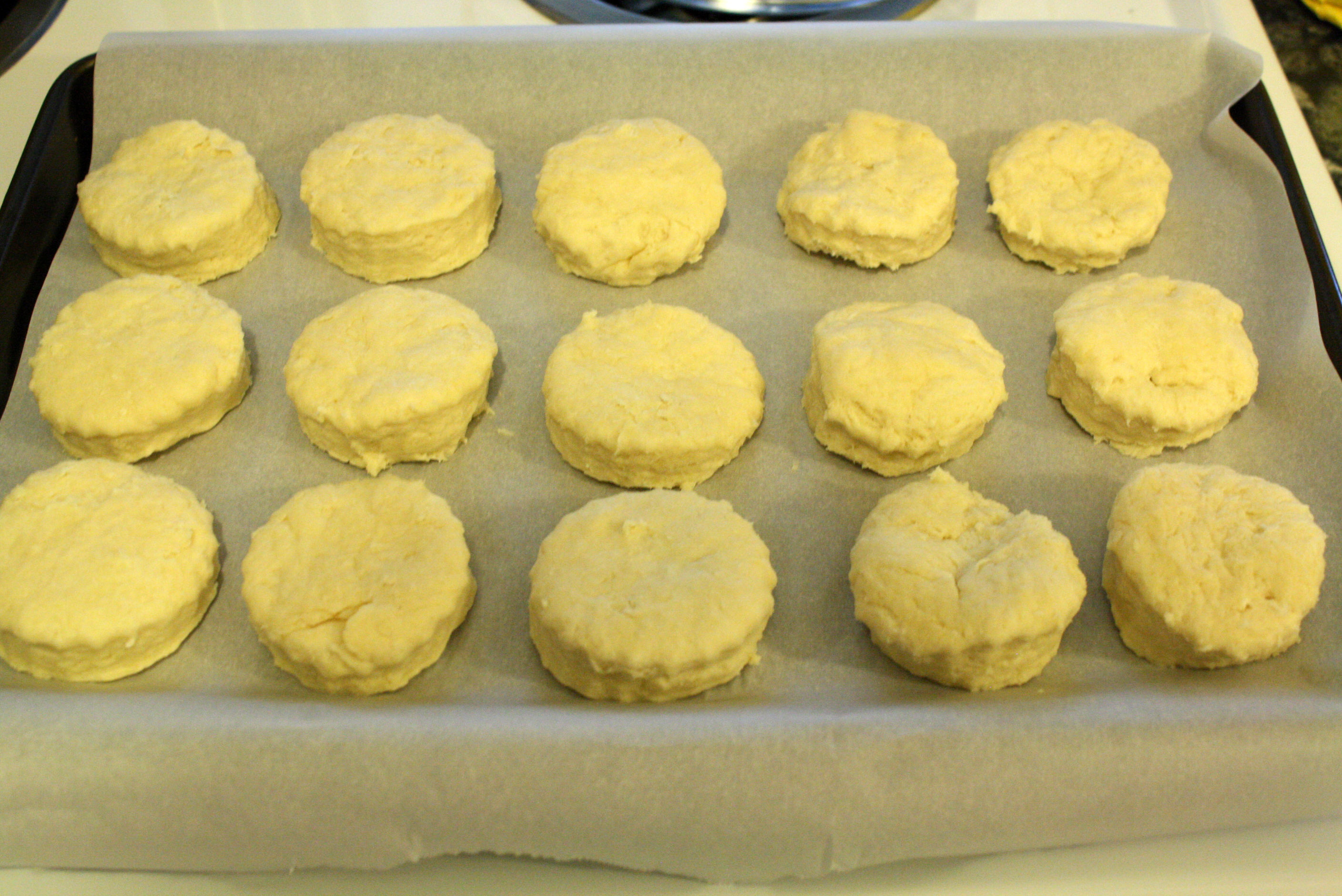 Line baking sheet with freezer or wax paper. Cut biscuits and place on the paper. Make sure they aren’t touching. Flash freeze them on the baking sheet for one hour. This will help them not stick together when you place them in the bag. After the hour is up place them in a freezer bag.